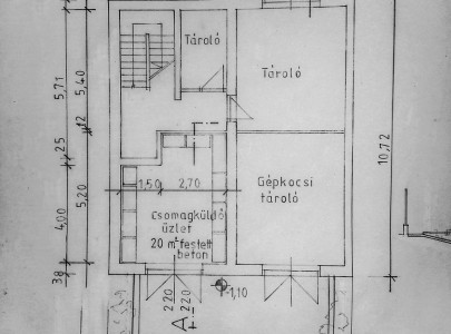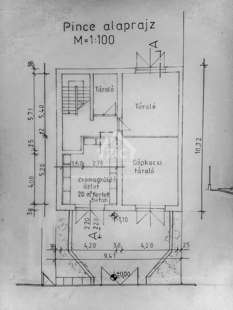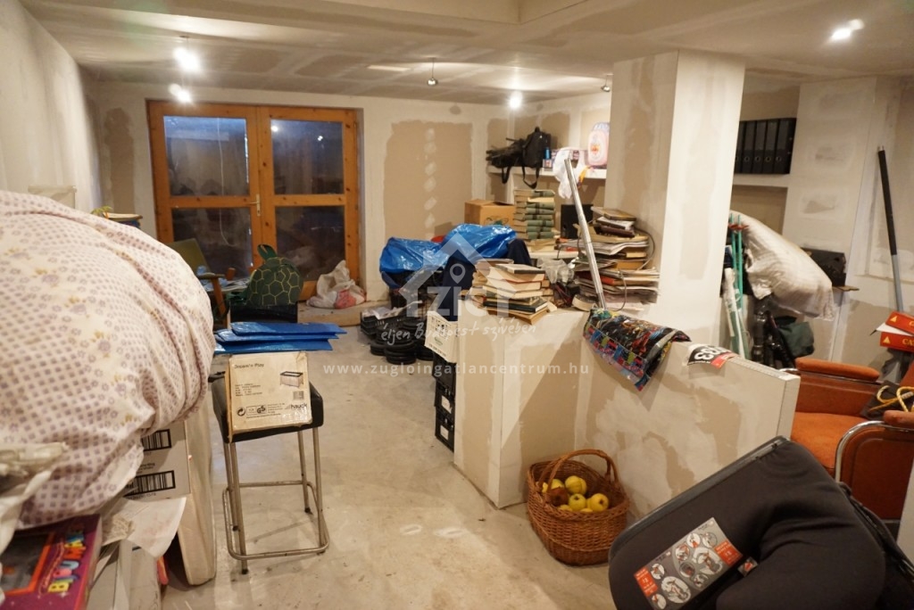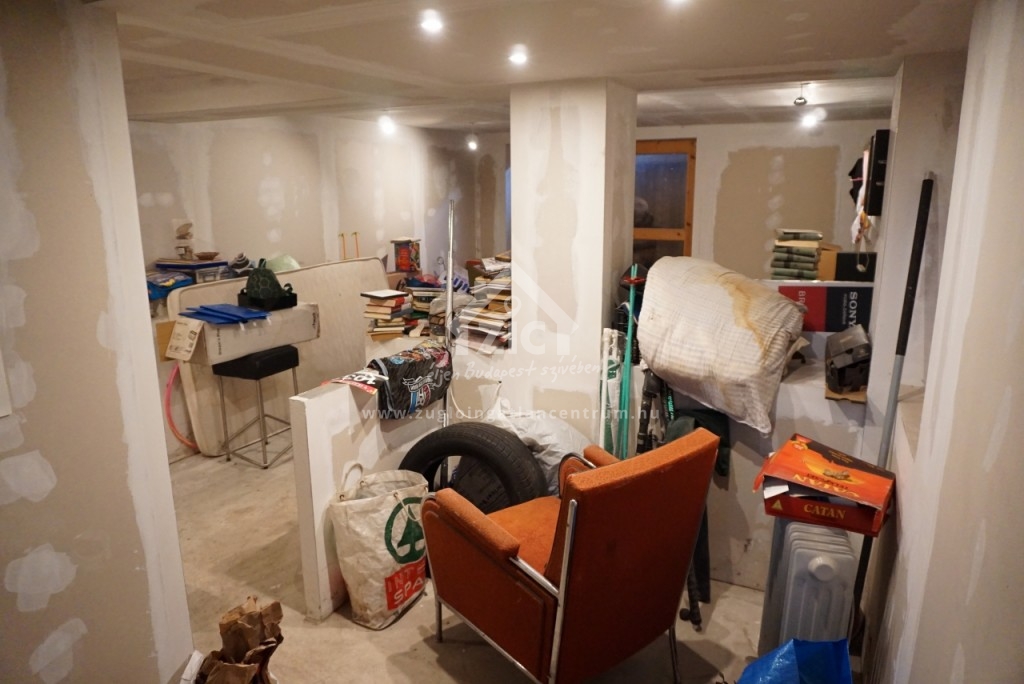 A ház alatti nagyméretű félszuterén helyiség eredetileg garázs volt, jelenleg befejezés előtt álló, akár kiadható üzlet vagy iroda helyiség.