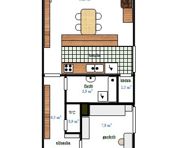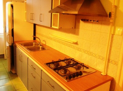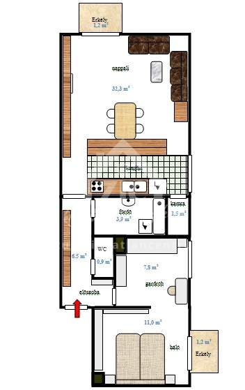 Beosztása optimális, a szobák külön nyílnak ám a nappali és a konyha ötletes egybenyitása révén mégis tágasak a terek.