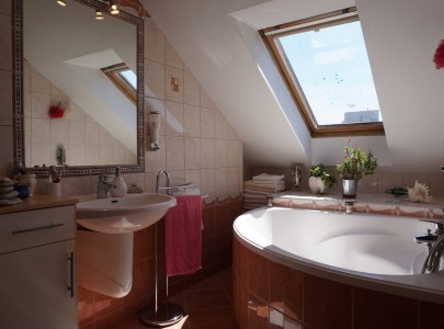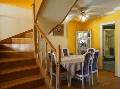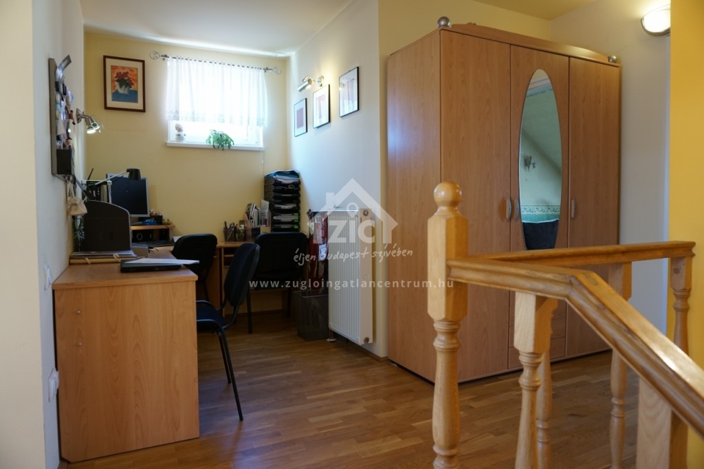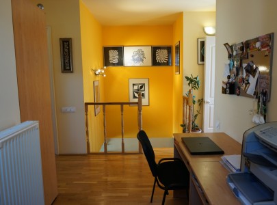Az alsó szinten található a tágas nappali ahonnan a terasz nyílik, a konyha, egy zuhanyzós fürdőszoba és egy hálószoba. Széles lépcsőn juthatunk a felső szintre, ahol a két nagy hálószoba mellett tágas sarokkádas fürdőszoba és dolgozószoba is található. Az emeleten akkor is tökéletes a nyugalom, ha lent zajlik az élet, itt nyugodtan pihenhet-dolgozhat.