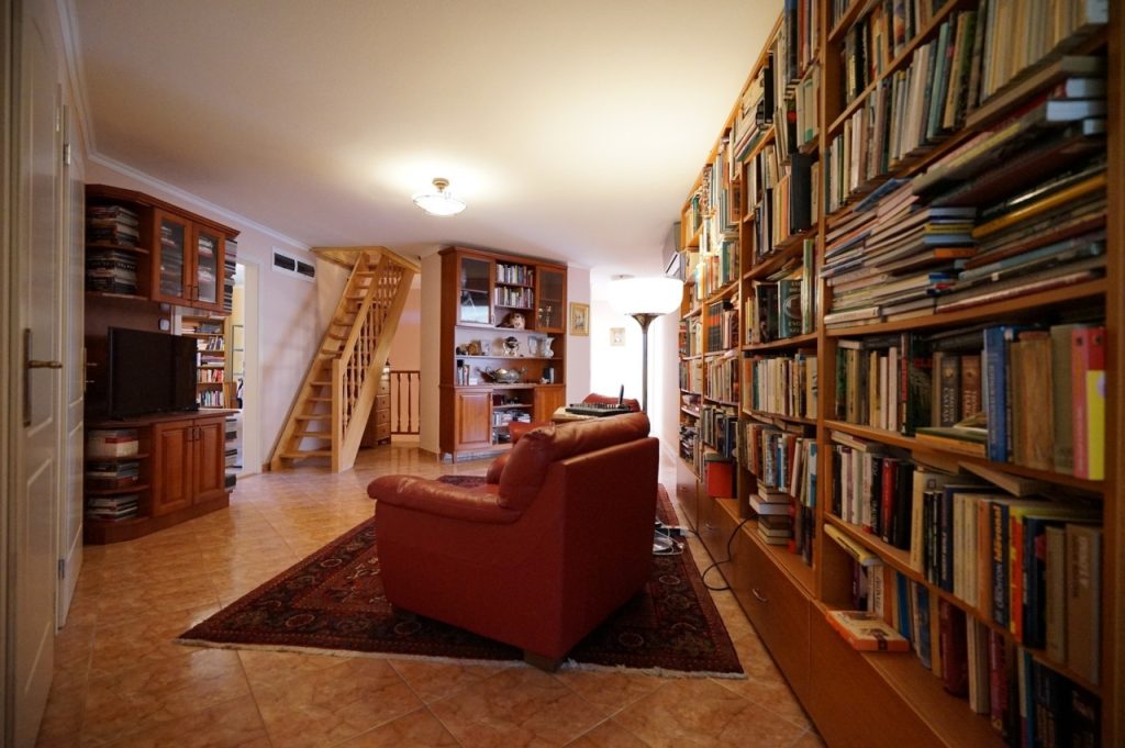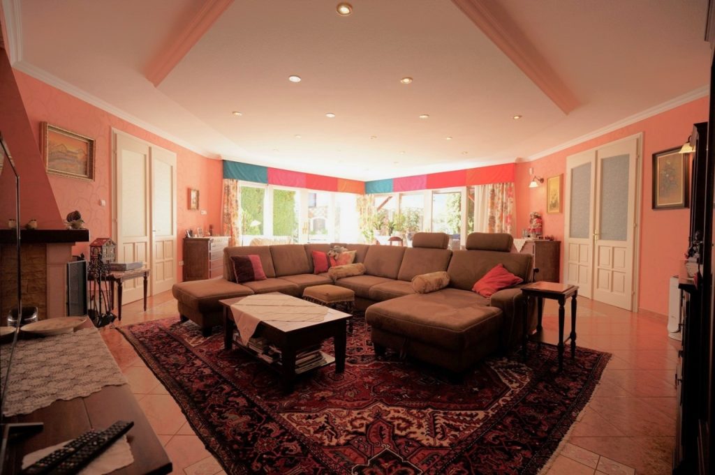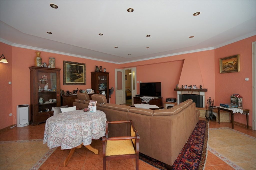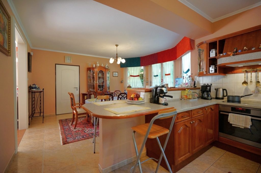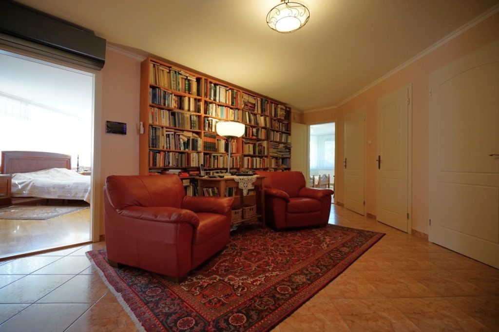 A 21nm.-es, jelenleg hűvös borpincének használt alsó szint felett, a földszinten található a ház centruma, egy tágas, világos, nem sértően, de azért elég nagy nappali a hozzá kapcsolódó konyha-étkező résszel és a fedett teraszokkal, valamint az utcáról a széles, egyenes burkolt kocsibejárón megközelíthető fűtött, két autós garázzsal.
