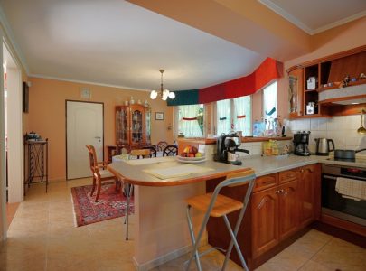 ár itt is, de fentebb is érződik a tervezői átgondoltság, a tulajdonosok praktikumra való törekvésének formába öntése; a földszint úgy elegáns és nagypolgári, hogy használója minden gyakorlatias igényének megfelel. A tágas gardrób szoba, a hétköznapokban oly hasznos mosókonyha, a nagycsaládos étkezőhöz stílusosan illeszkedő, cseresznye konyhabútor, a hangulatos kiülős teraszok mind mind a praktikus tervezés esztétikus, egyben jól lakható megjelenítései.