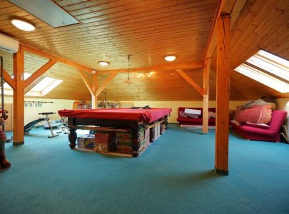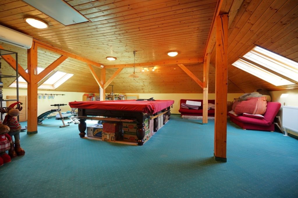 A tetőtérben sem szokványos, amit látunk; itt egy tetőtéri vasbeton födémen nyugvó (!), majdnem 100nm.-es, akár önálló lakásnak is használható ( a szükséges gépészet megvan), egy légterű szintet látunk, melynek jelenlegi funkciója játékszoba.