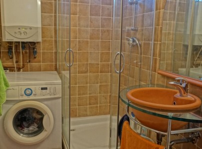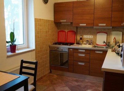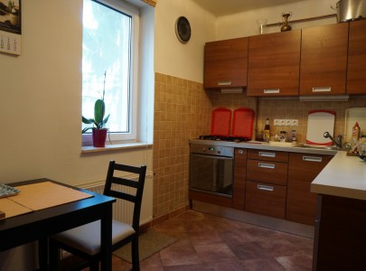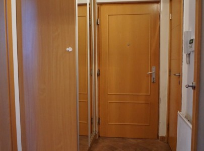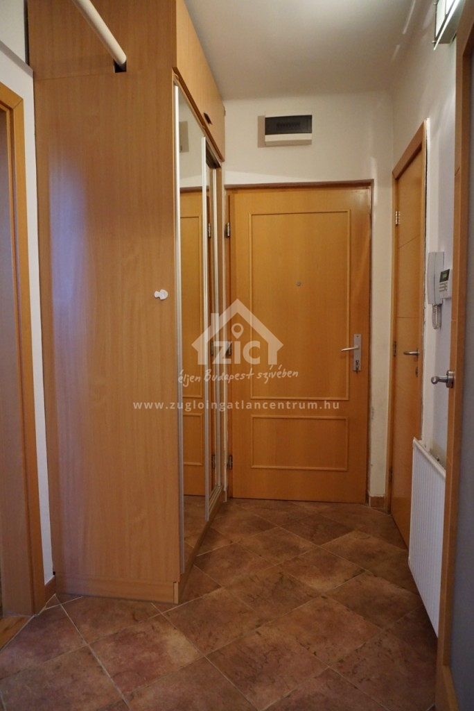 A lakás tartozéka még a berendezett és gépesített konyha, valamint az előszobai tágas, tükrös beépített szekrény.