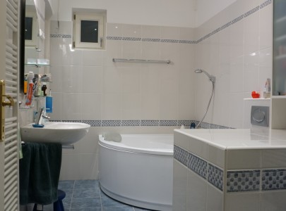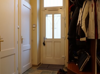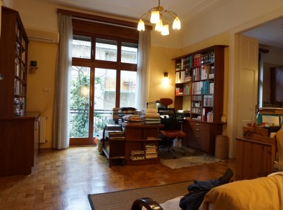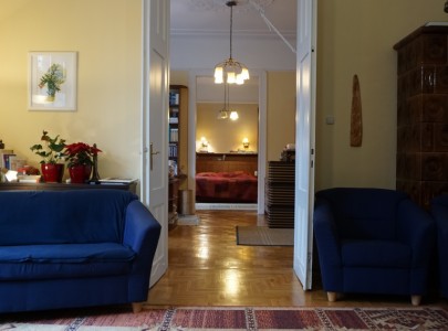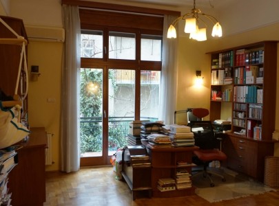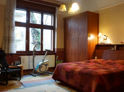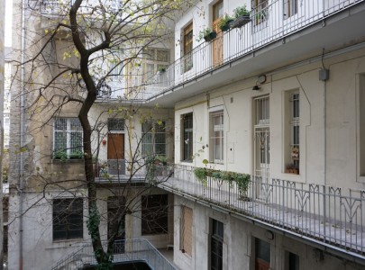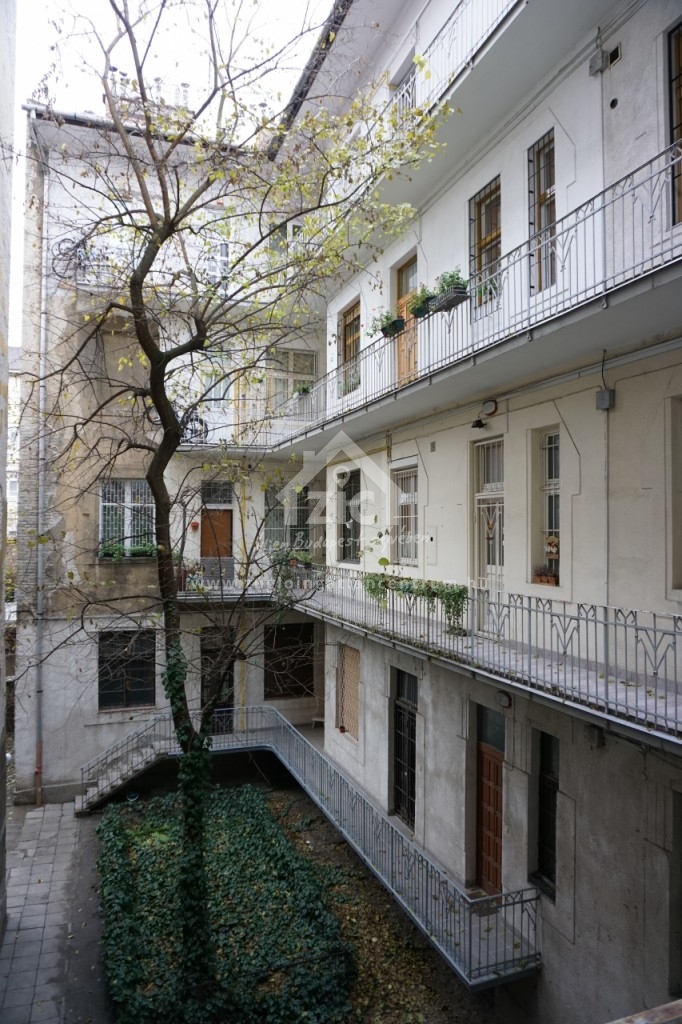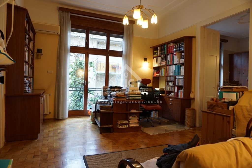 Az emeleti lakás az épület mögötti ősfás-kertes részre tekint, ahol egész nap teljes a nyugalom, a lombok suhogása és madarak dalán kívül más nemigen hallható..