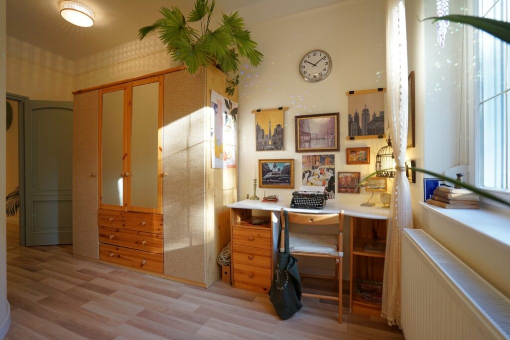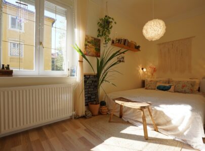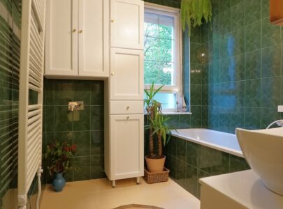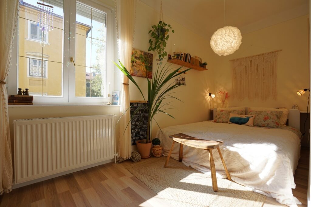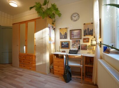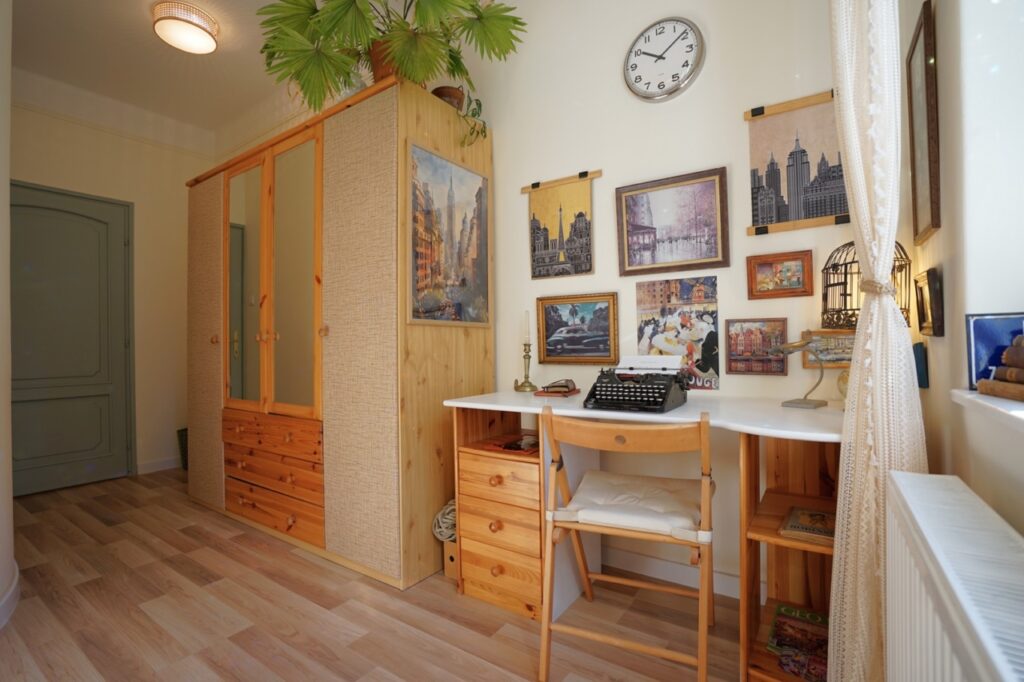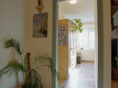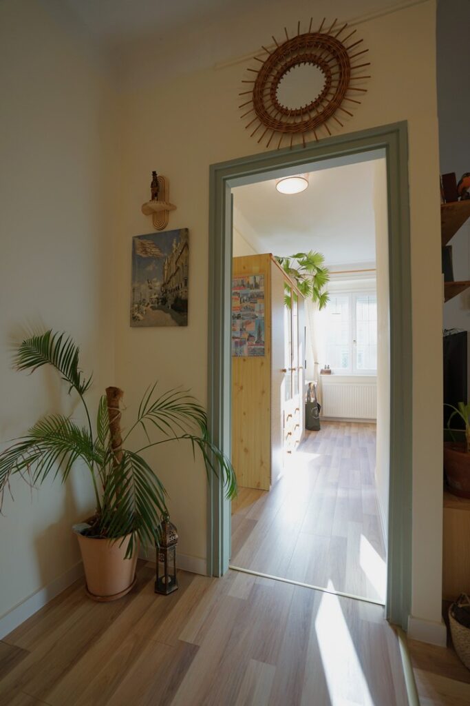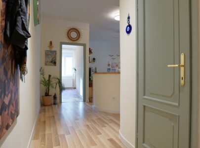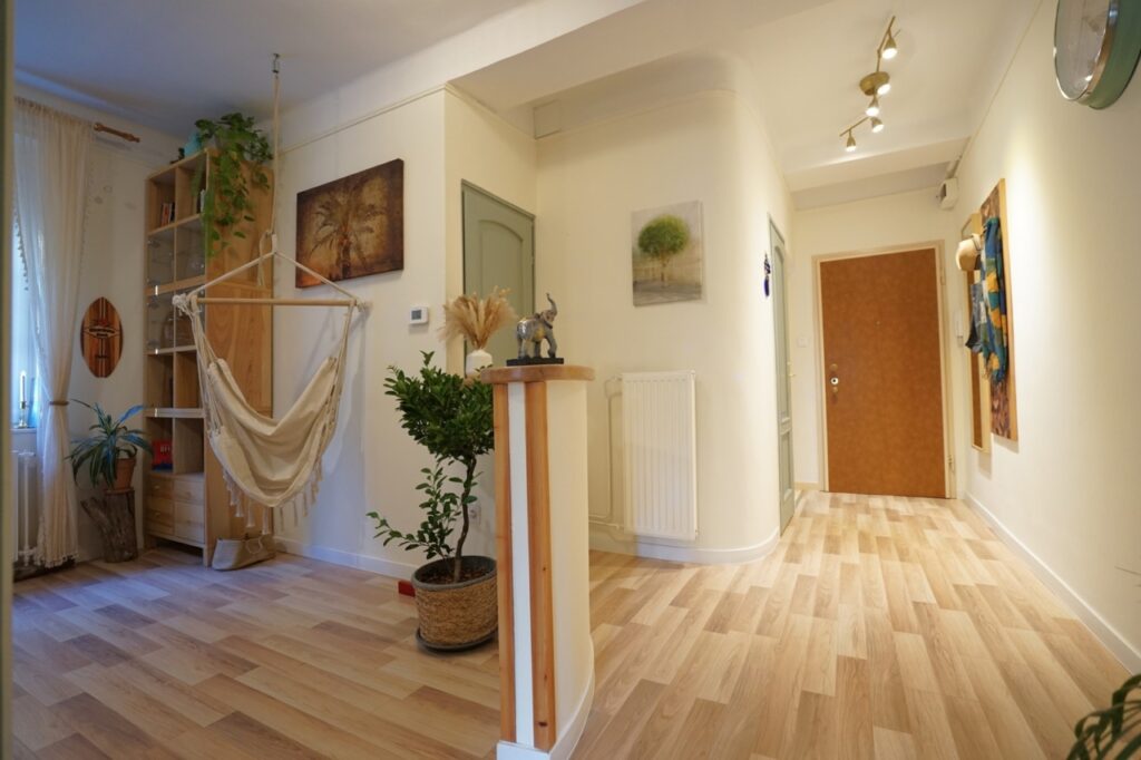 A lakás a vastag falaknak is köszönhetően nyáron kellemesen hűvös, télen pedig meleg. És nagyon jól szellőztethető a több irányba nyíló ablakok révén.